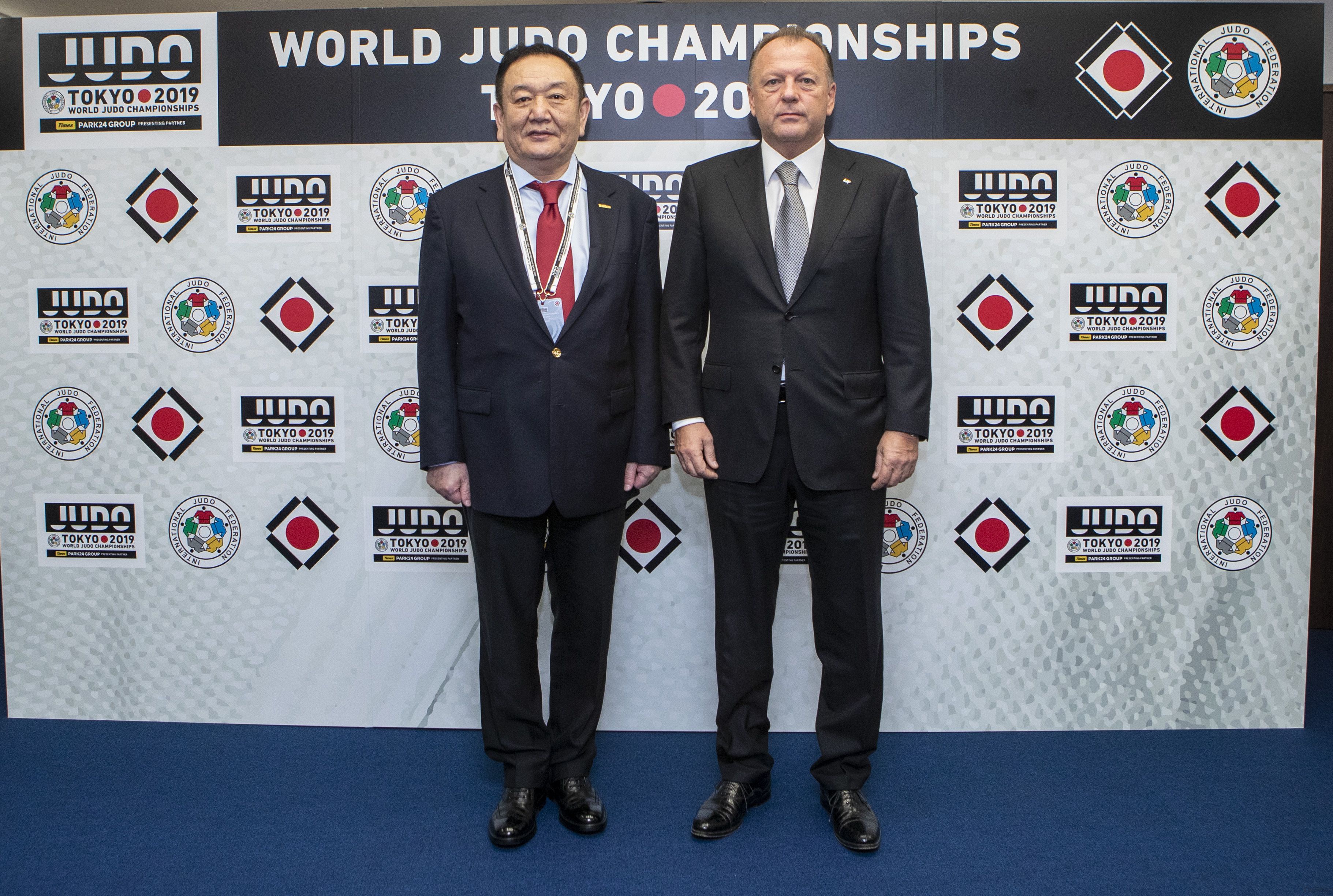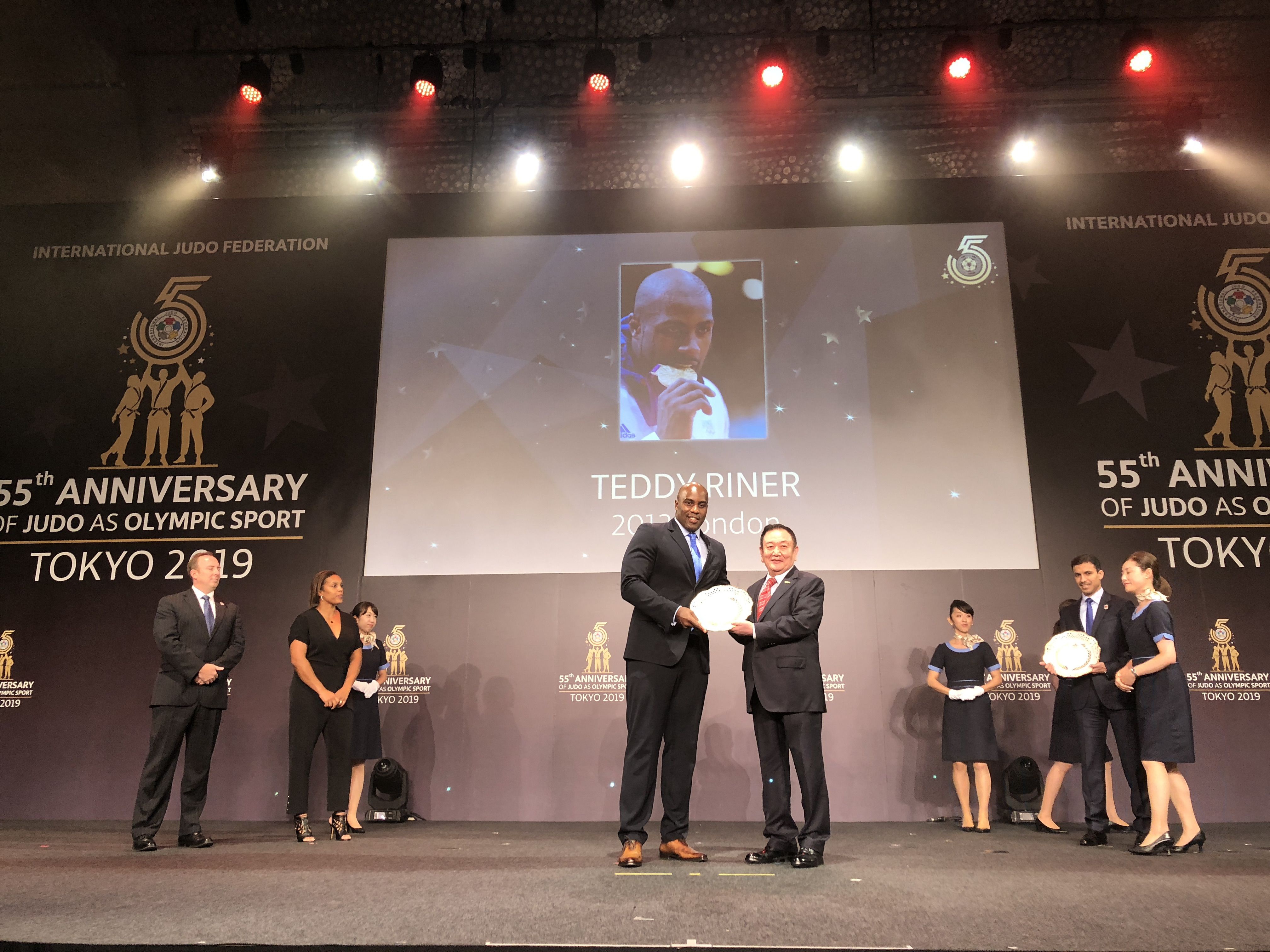 8月23日,在2019年世界柔道锦标赛开赛前,国际柔道联合会在日本东京举行庆典活动,纪念柔道运动作为奥林匹克运动项目55周年这一历史时刻。仪式上,国际柔道联合会将近60年来为世界柔道运动做出贡献的运动员与组织机构颁发奖项。新健体育产业集团作为国际柔道联合会顶级合作伙伴受邀出席,董事长卞志良作为特邀嘉宾为伦敦奥运会最佳男运动员Mr. Teddy Riner,伦敦奥运会最佳女运动员Mrs. Lucie Decosse 颁奖。