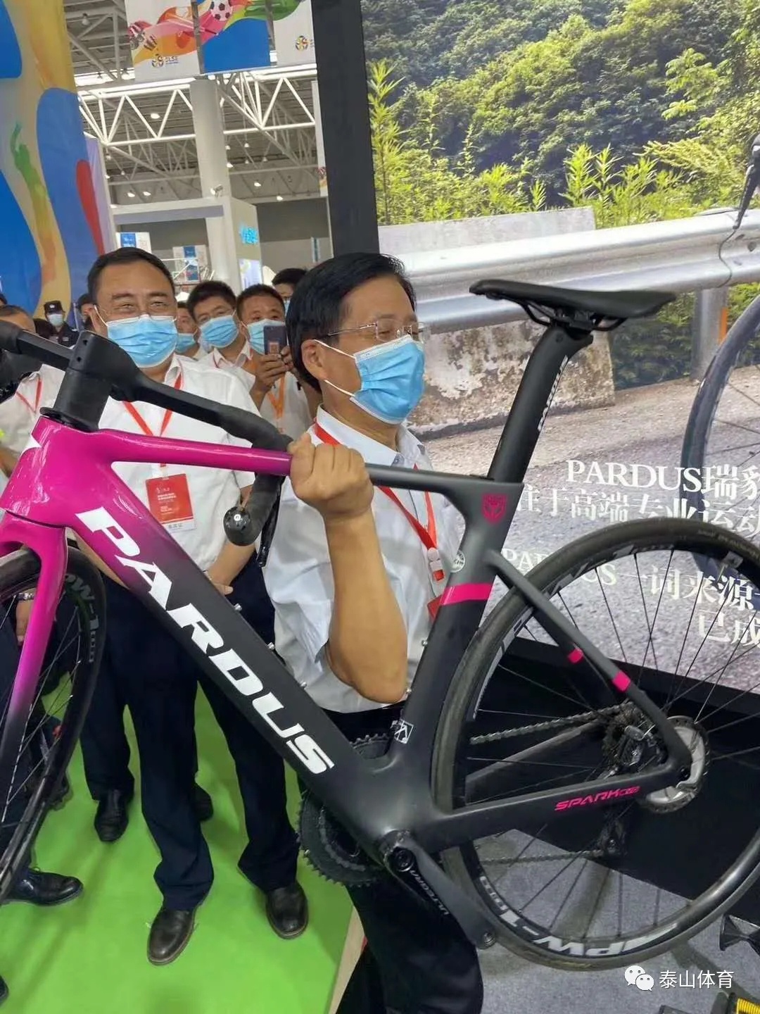 随后,山东省副省长孙继业一行在新健集团常务副总裁卞国峰的陪同下来到新健体育所在场馆进行详细考察,对于新健瑞豹碳纤维自行车、新健体育工程等产品与项目进行深入了解。期间,孙继业副省长饶有兴致的对于新健瑞豹进行详细了解,特别关注获得"中国优秀工业设计奖金奖"的新健瑞豹全碳变速互换计时车产品的具体情况,并亲自单手提起具有奥运赛场征战经验的碳纤维自行车。他表示:"山东省委省政府将积极推动体育产业列入我省的支柱产业,鼓励企业制定长期发展战略规划,通过打造体育产业龙头企业,形成一个迅速爆发的体育产业生态。期待新健集团充分发挥自身国际资源、科技创新、标准制定等核心优势,不断做大做强,让山东体育产业的优势地位凸显的淋漓尽致,形成山东体育产业集群。"