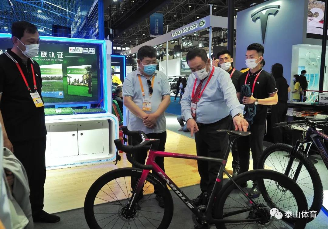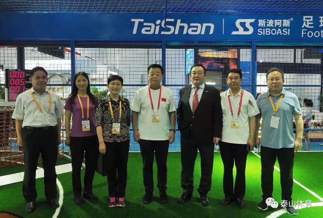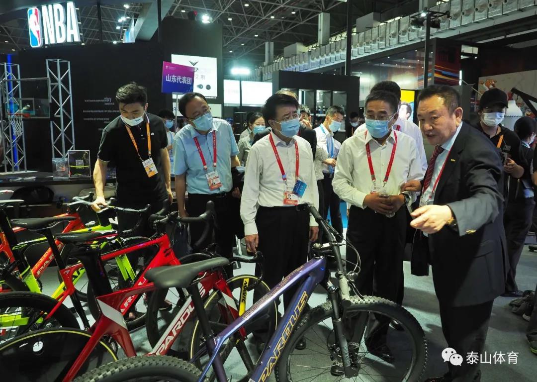 山东省商务厅厅长张德平在新健体育产业集团董事长卞志良陪同下参观一号馆新健体育展厅。