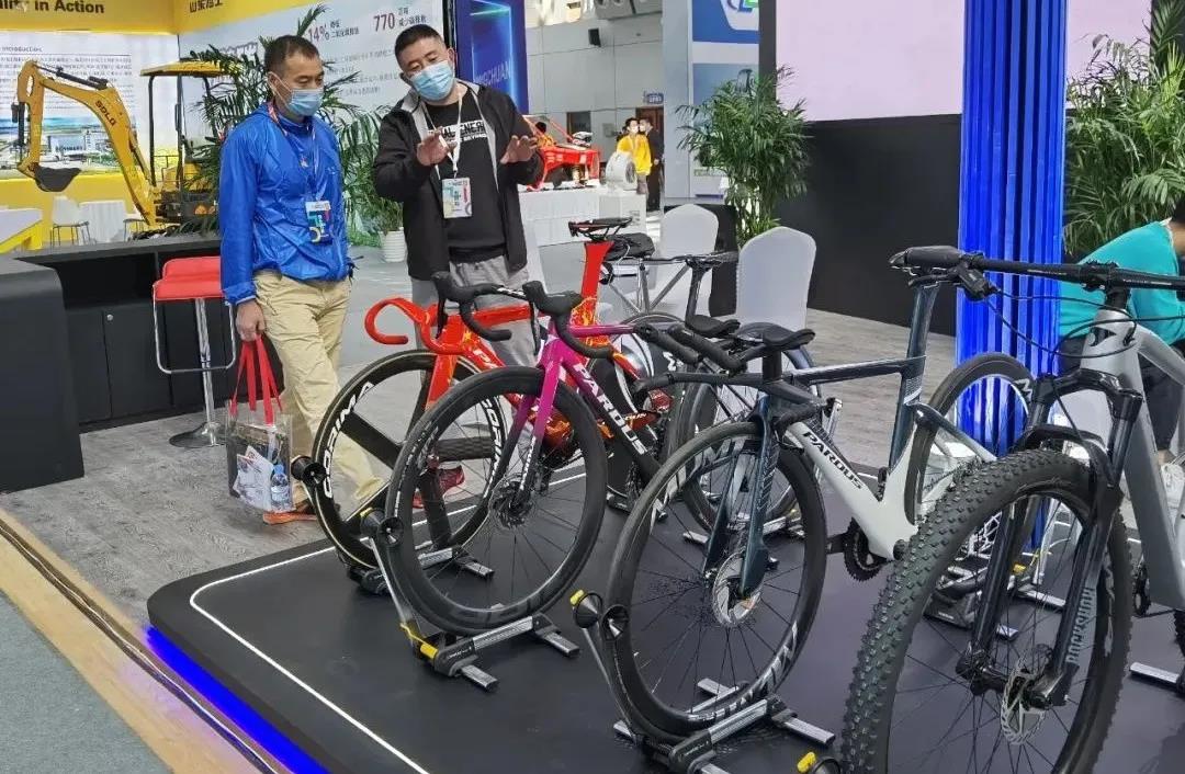 聚焦“设计+运动”领域,新健体育展出的瑞豹自行车精品,外观借鉴了第五代战斗机的设计理念,极具力量感与科技感的车身得以拥有更小的风阻。新健瑞豹设计师将运动员与车辆构成的整体系统进行设计,“这就是所谓的人机系统”, PARDUS瑞豹通过空气动力学优化,实现了自行车轮组、前叉、车把、立管等结构与人体的高度整合,最大限度减少了空气扰流的影响。