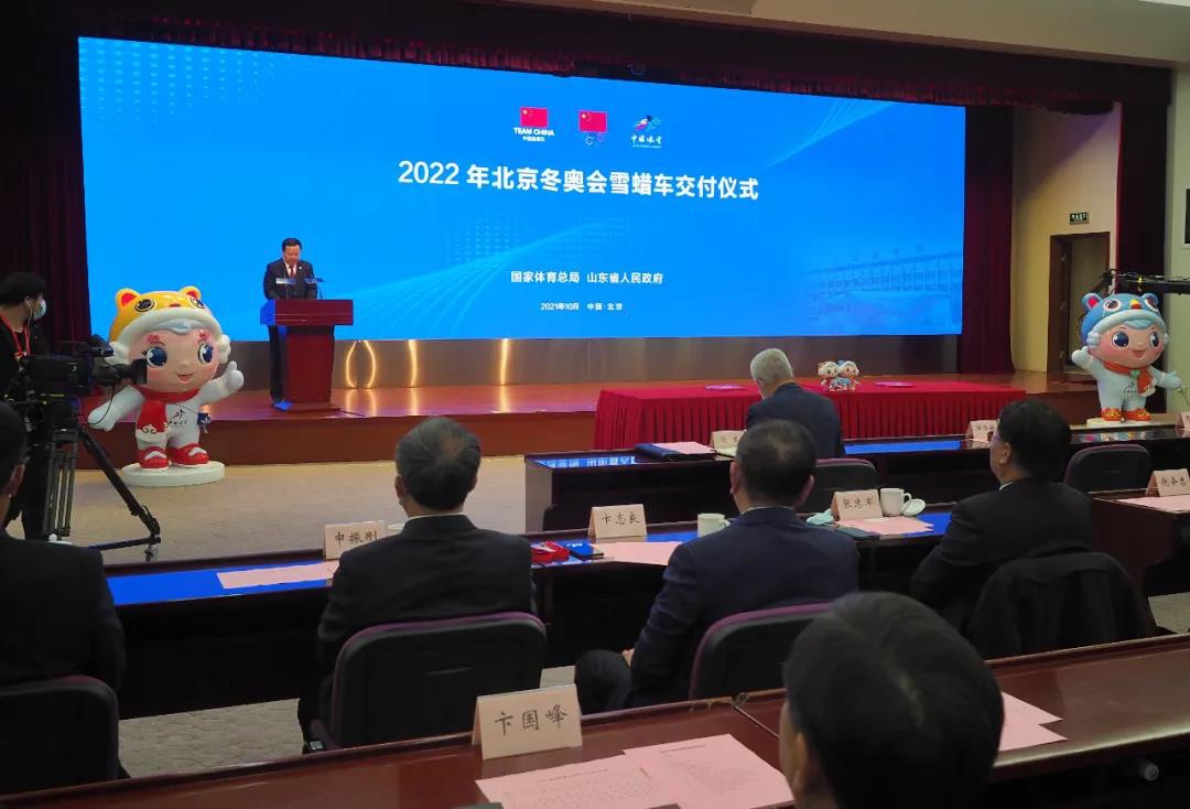 交付现场,北京冬奥任务联合攻关指挥部总指挥、山东省副省长凌文将雪蜡车模型交付至国家体育总局冬运中心倪会忠主任手中。让我们共同期待冬奥会上我国运动员能在本土赛场上多拿奖牌,为国争光。