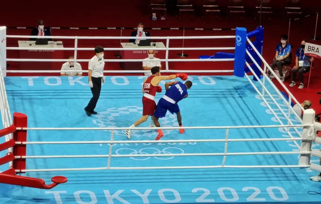 东京奥运会拳击热身馆,意昂体育工作人员帮助运动员穿戴拳击手套