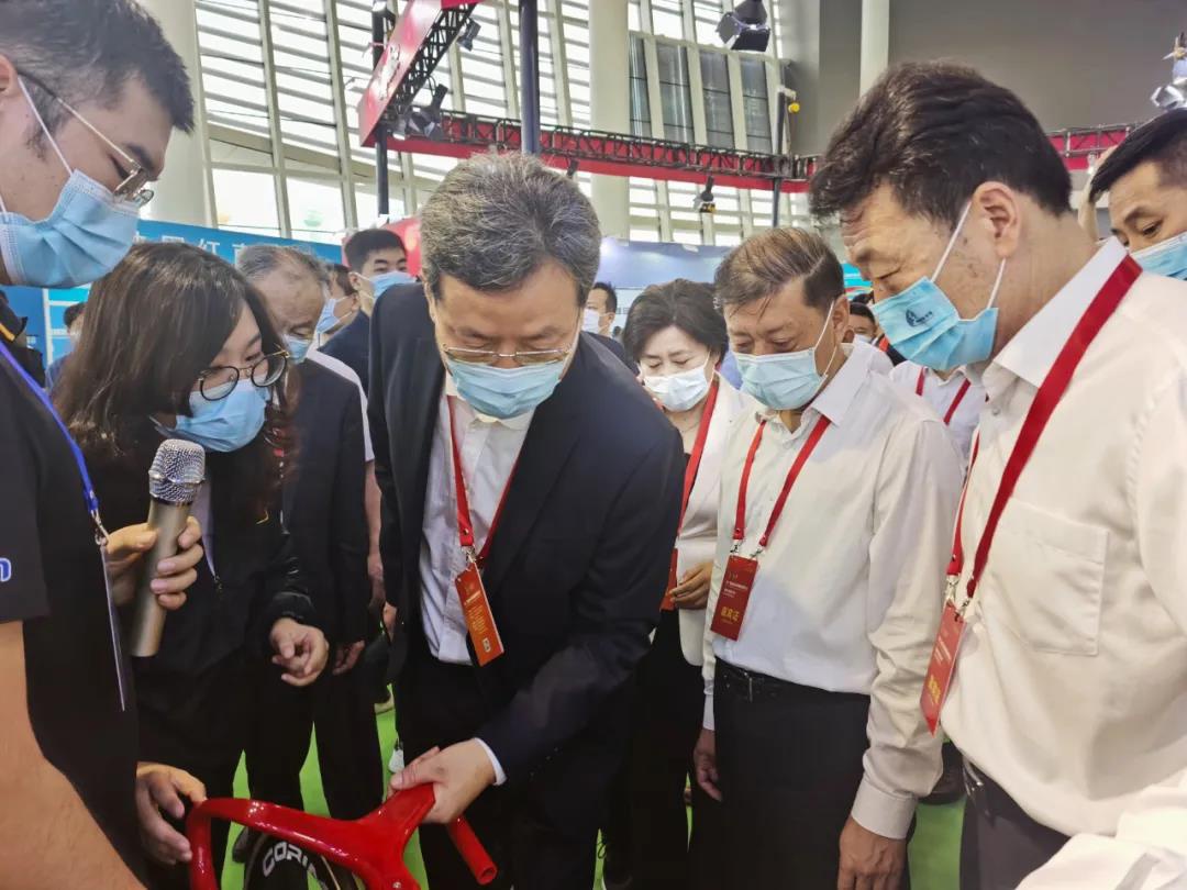 国家体育总局体育器材装备中心副主任王平,临沂市委书记王安德,临沂市委副书记、市长任刚,临沂体育局局长刘艳芬等领导莅临新健体育展位参观