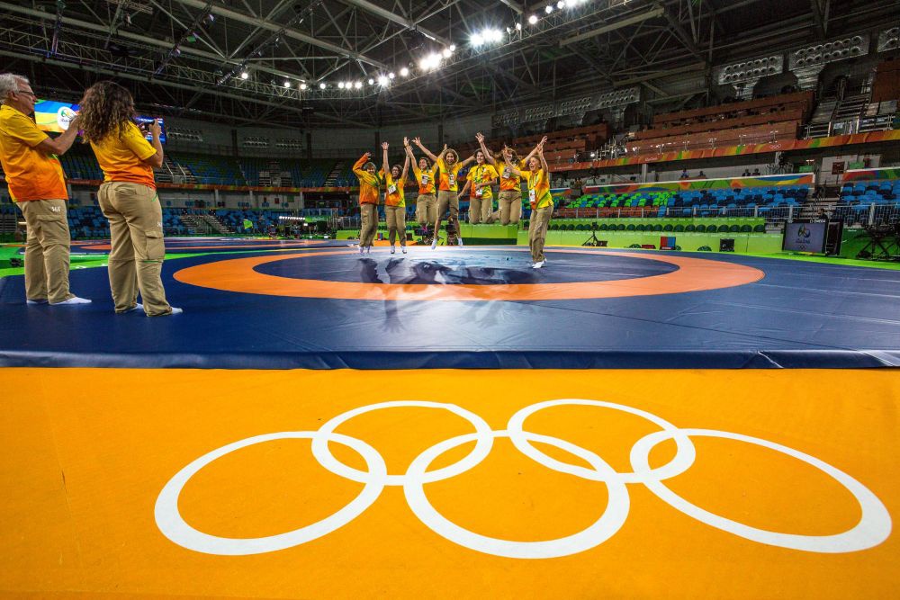 2016年8月18日,在里约奥运会摔跤场馆内,场馆工作人员和志愿者在摔跤垫上合影留念,这届奥运会的摔跤垫来自中国山东新健体育集团。新华社记者刘彬摄