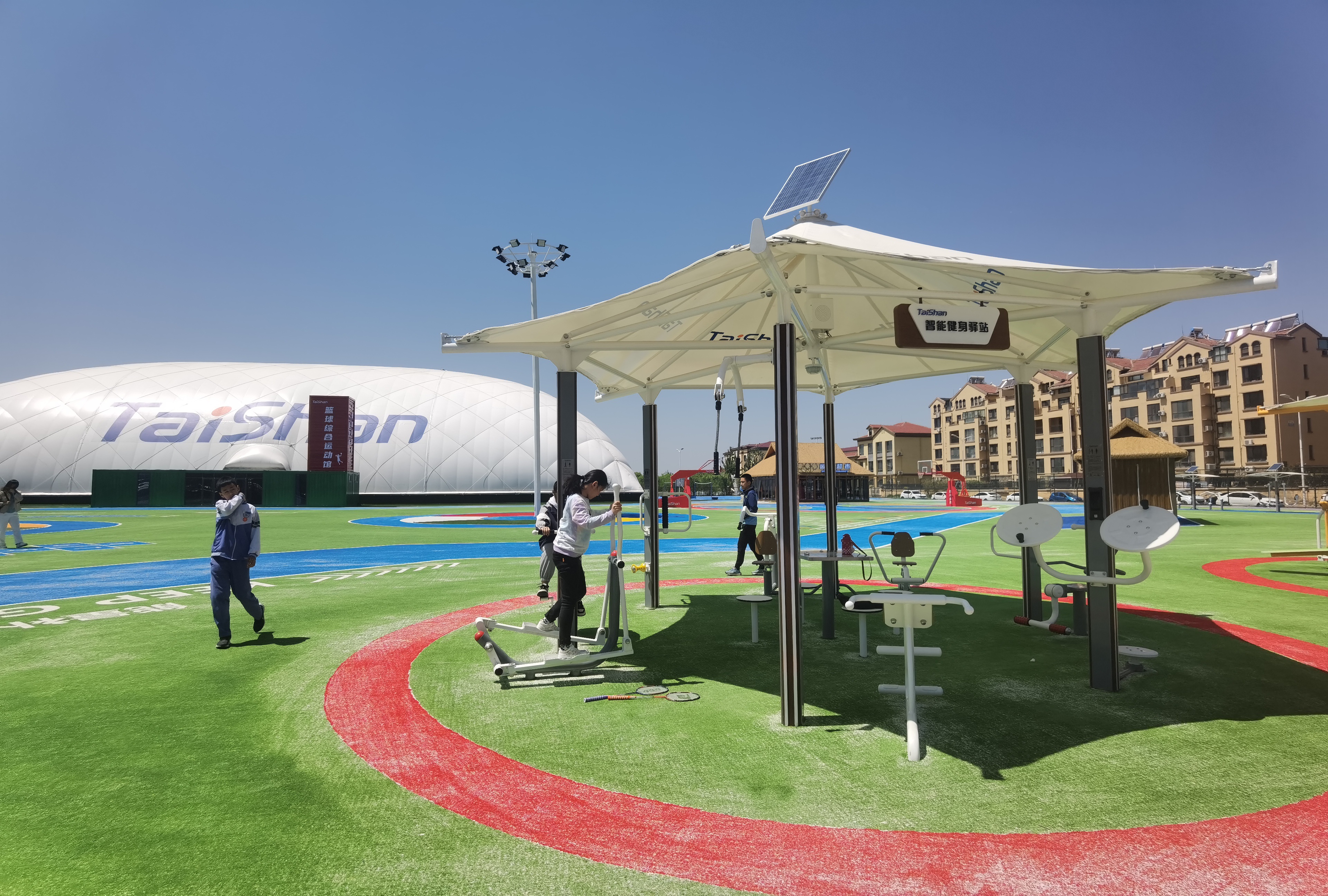 在场地铺设上,均采用新健新材料功能人造草铺设,全方位保证运动安全和环保;气膜式篮球综合运动馆,内部设置2片篮球场、6片乒乓球场地及1片网球场。网球场同时套线4个羽毛球场地。场馆内可以满足体育运动,体育教学及群众比赛需求。从场馆到运动超市、智慧体测小屋,全部采用可装配式建筑。