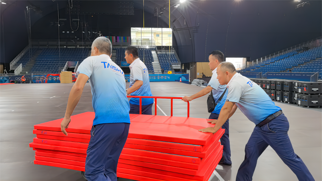 新健体育的专业安装团队以满腔热情和高效执行力,致力于柔道与摔跤比赛场馆的设备安装工作。在本届奥运会上,新健体育不仅提供了高品质的产品,还特别派遣了核心工程师团队。这支团队凭借多年的国内外大型赛事服务经验,确保每一环节的安装工作均满足国际顶级赛事的严格标准。